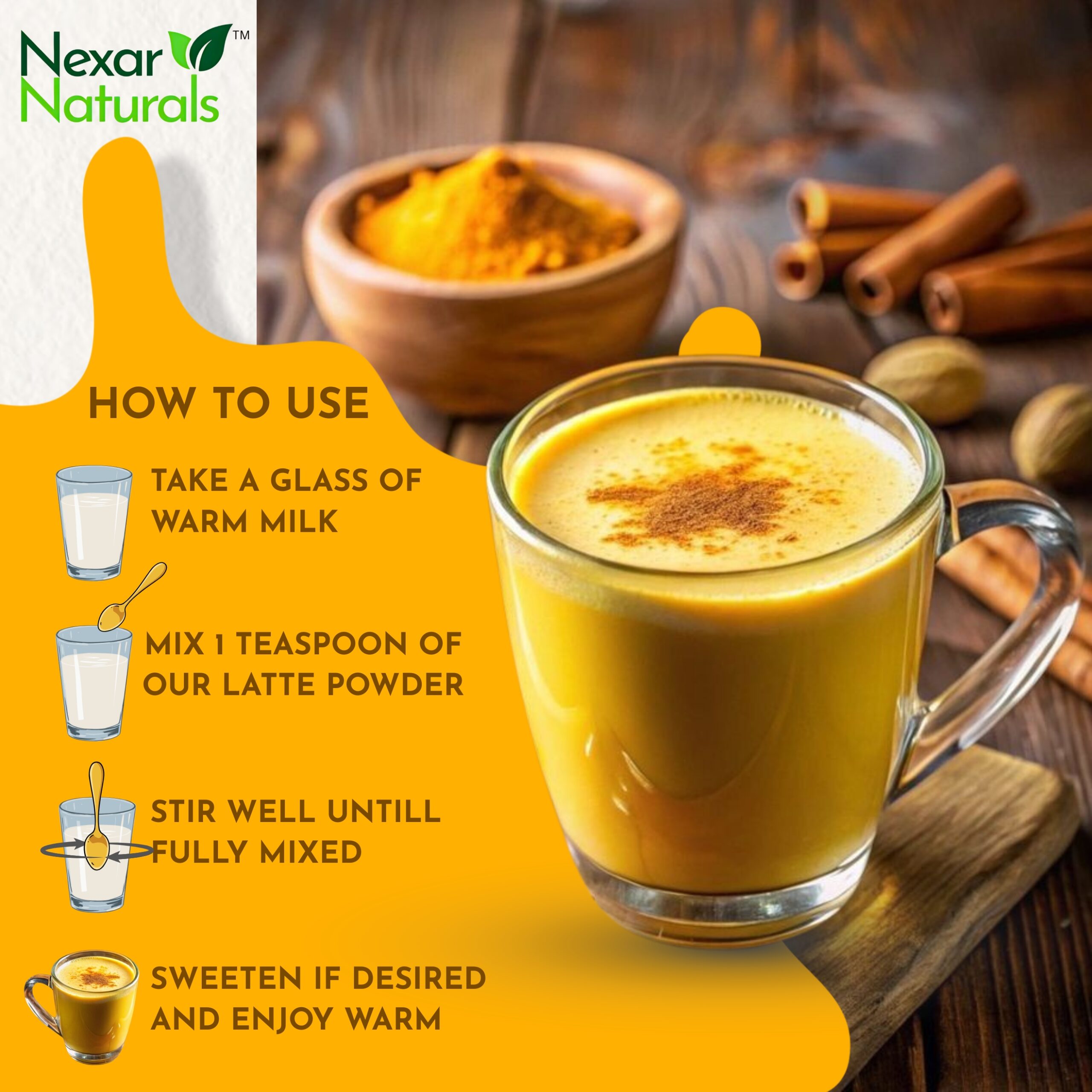 Mix 1 teaspoon in warm milk (or plant-based milk). Add honey or jaggery if desired. Best enjoyed daily, especially before bedtime.